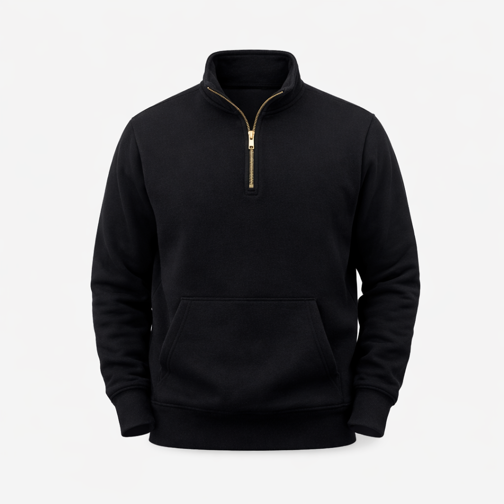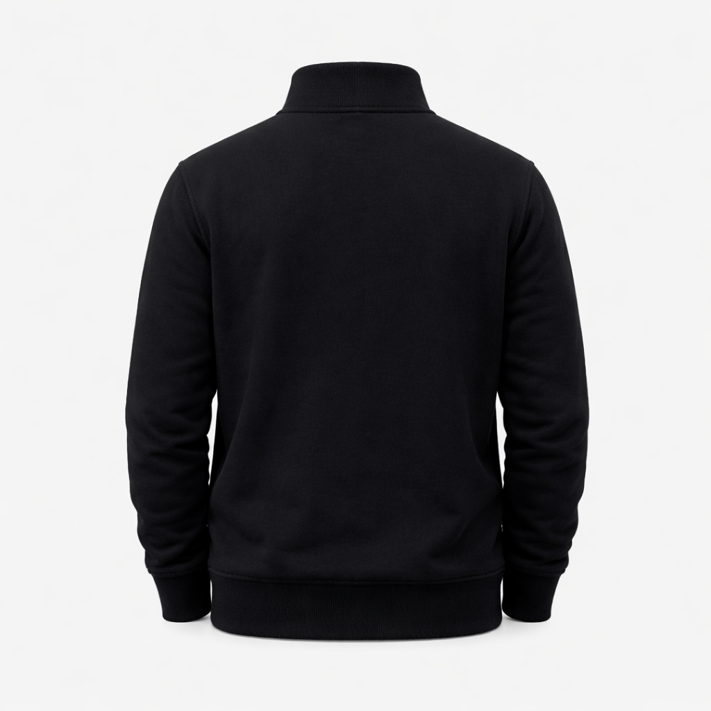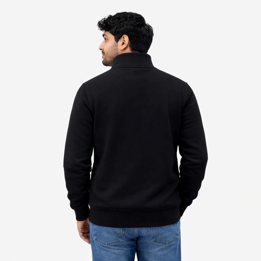 Premium black quarter-zip sweatshirt with soft warm fabric, modern fit, and stylish high-neck design for everyday comfort.